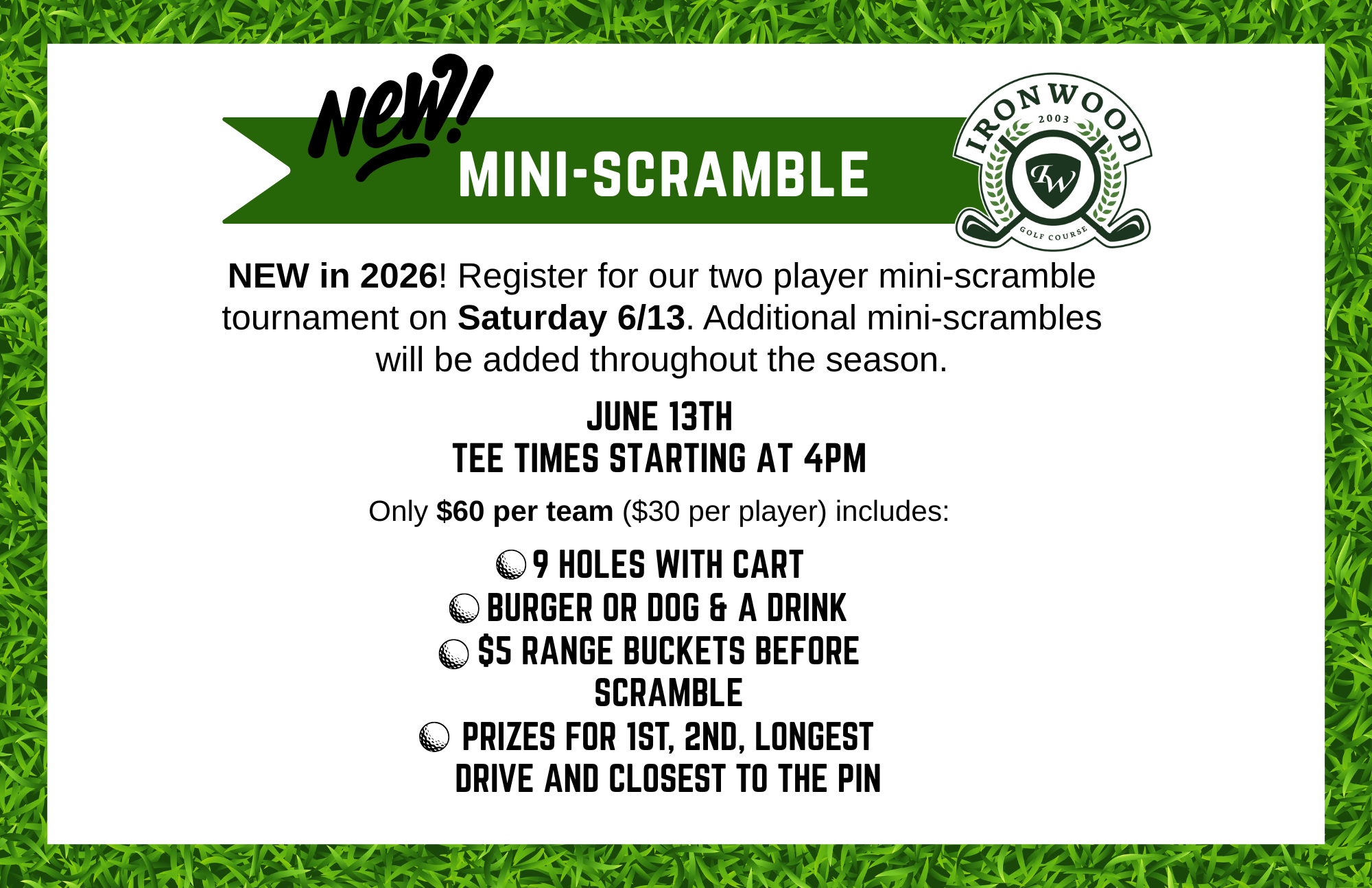 It’s everything you love about our classic scrambles, just in a quicker 9-hole format. Cart included, food at the turn, and amazing prizes up for grabs.
