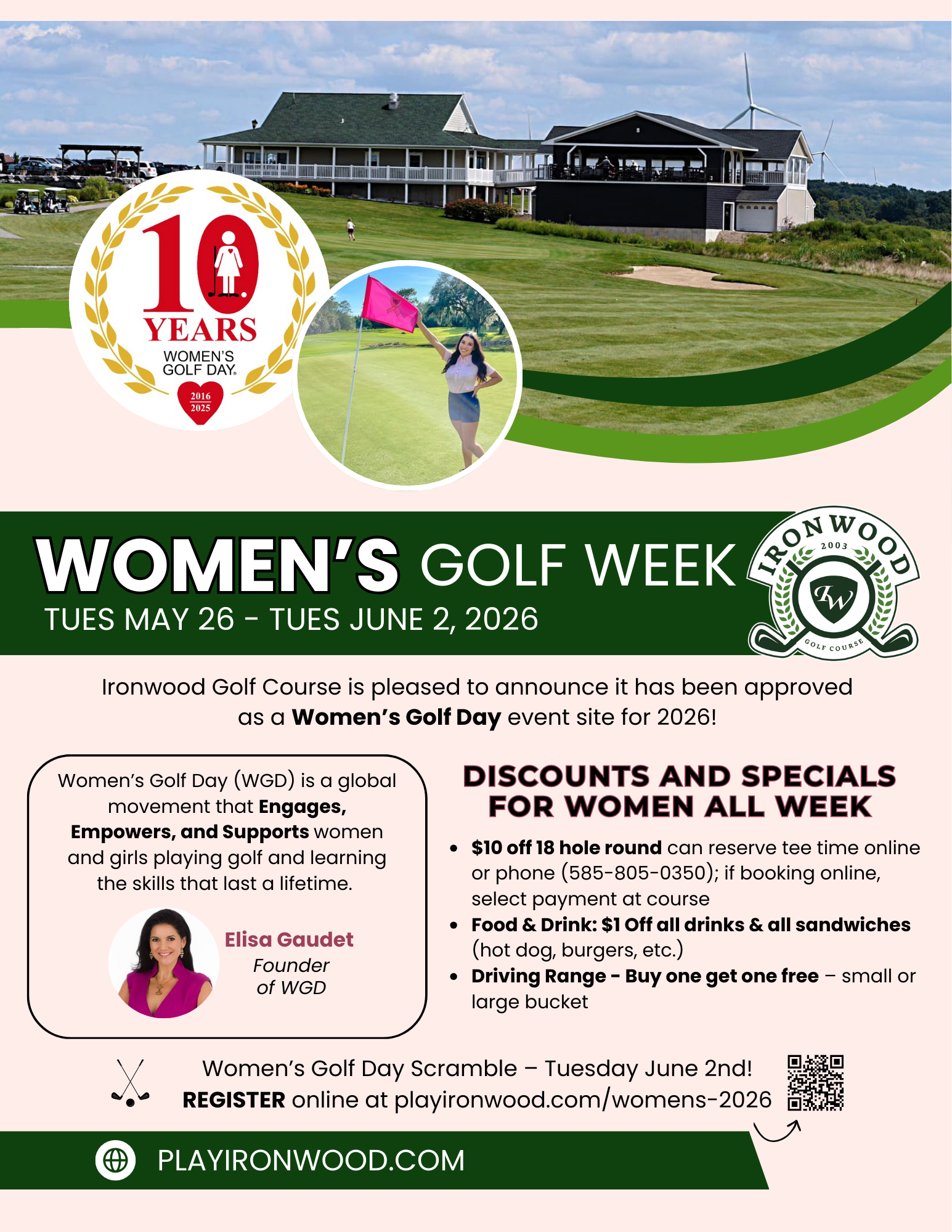 Ironwood Golf Course is pleased to announce it has been approved as a Women’s Golf Day event site for 2026! Celebrate from 5/26 – 6/2 at Ironwood with food & drink specials, discounted rounds of golf, and bogo driving range buckets.